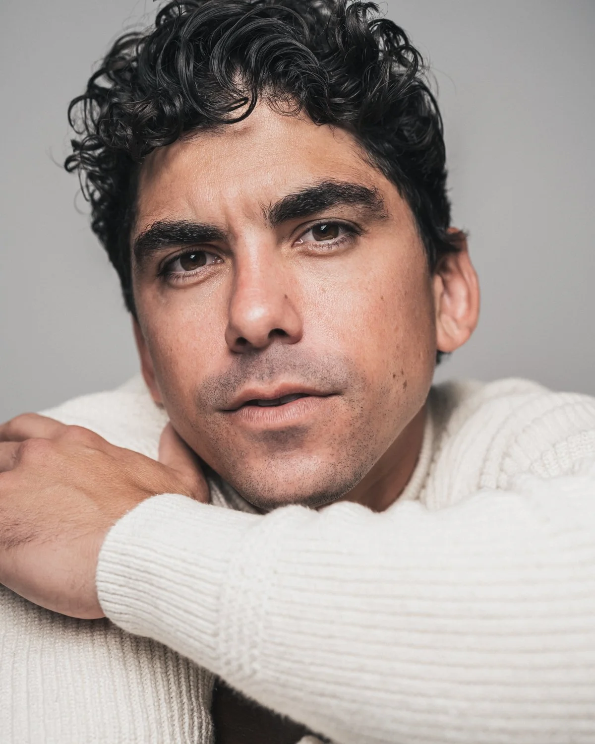 Close-up portrait of a man with dark curly hair and light to medium skin tone, wearing a cream-colored sweater, resting his head on his arm against a gray background.